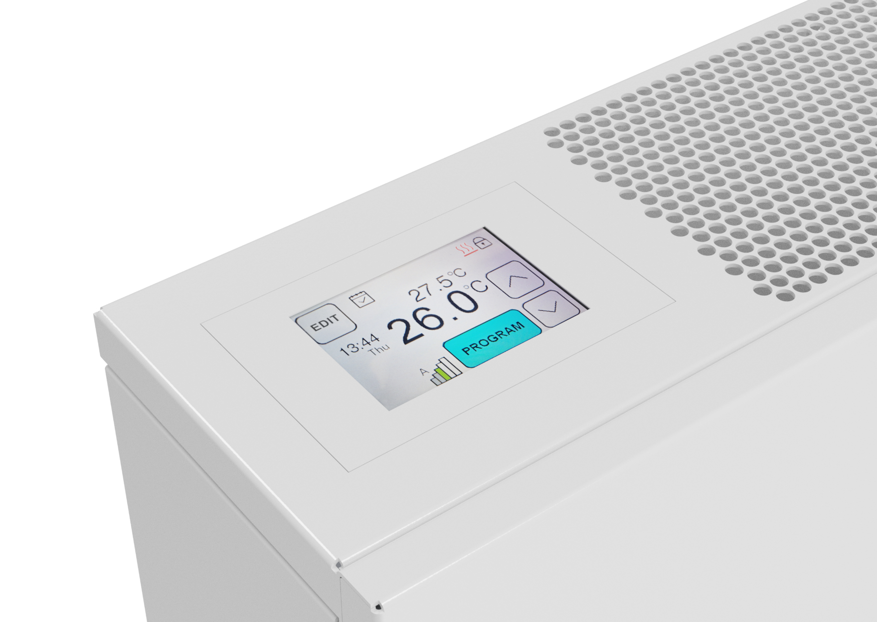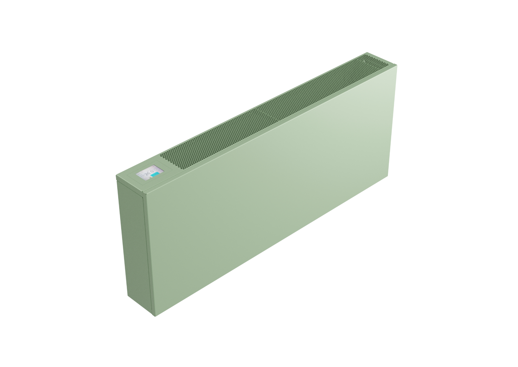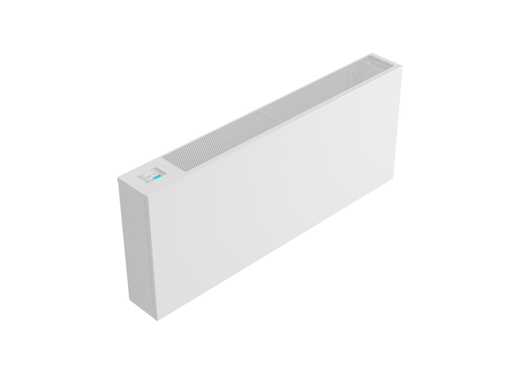 Fan-operated wall-mounted heaters are distinctive for their compact appearance. They operate as separate independent units, continuously scanning the ambient temperature and the temperature of the heating/cooling medium in the lamellar heat exchanger. All input data are analyzed by the control module, adjusting the convector function accordingly. It opens/closes the water flow and regulates the fan speed until the desired room temperature is reached. The mode and required parameters are set using a color touch screen, located on the top of the housing, next to the exhaust grill.